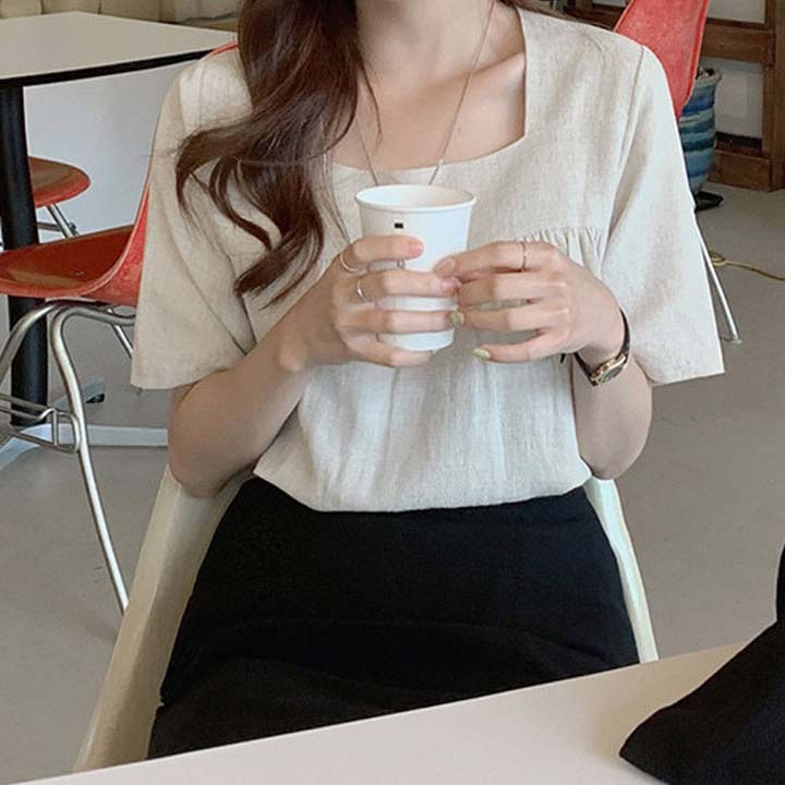 쇄골라인을 돋보이는 린넨 스퀘어넥 반팔티