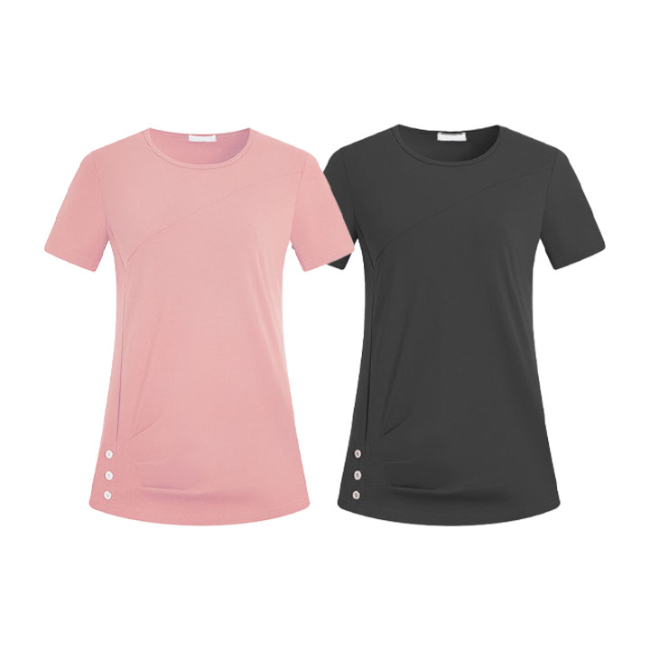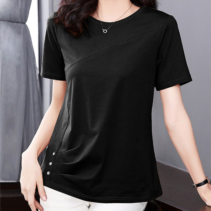 매끄럽고 후들후들한 소재로 더운 여름에도 착용하기 좋은 버튼 반팔티